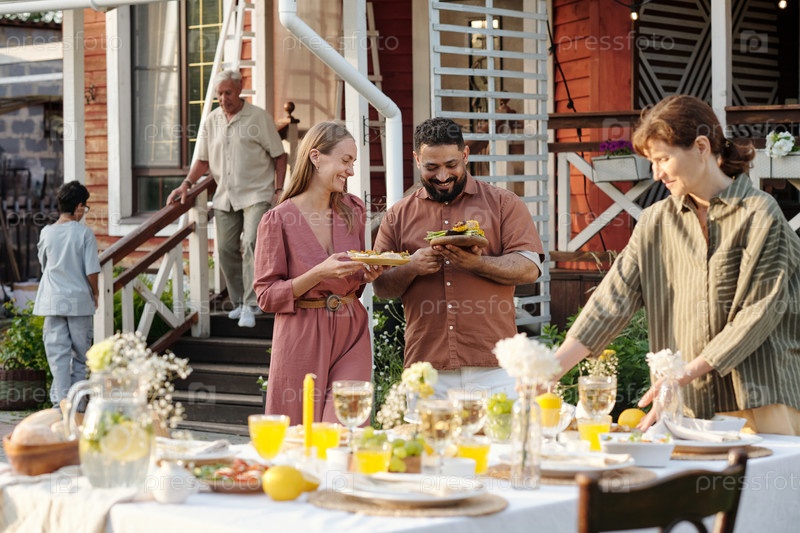 Мультиэтнические взрослые улыбаются, подавая еду во время встреч на открытом воздухе