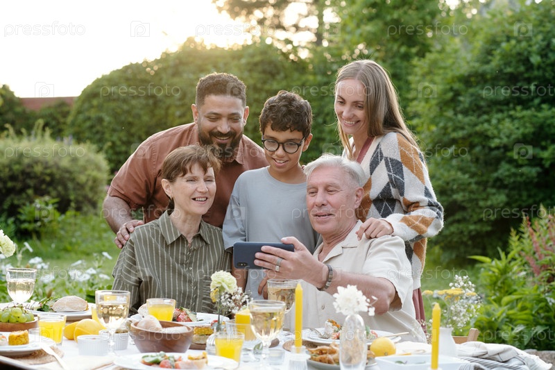 Мультиэтническая семья собирается на открытом воздухе, улыбаясь и делая селфи вместе