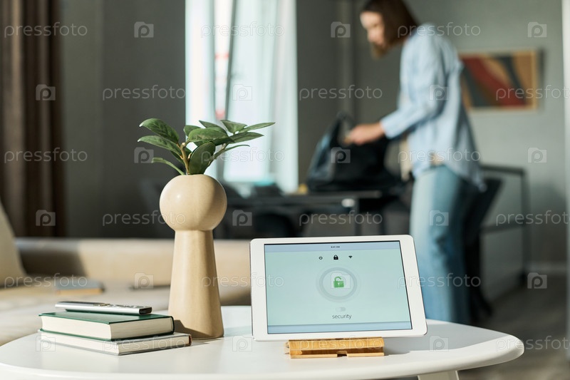 Молодая женщина упаковывает сумку, пока планшет отображает экран безопасности