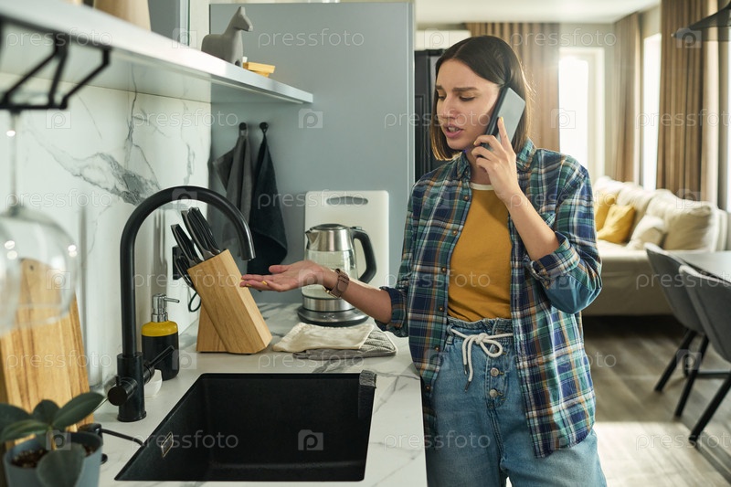 Молодая женщина разговаривает со смартфоном, пока жестикулирует на кухне
