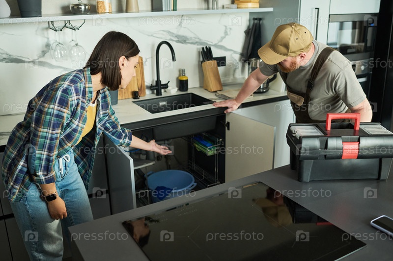 Молодая женщина консультирует мужчину среднего возраста по ремонту раковины