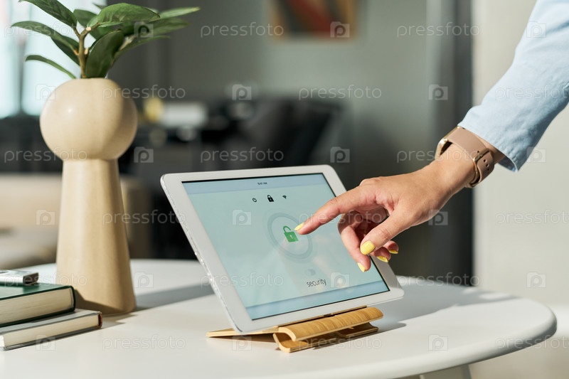 Молодая взрослая женщина активирует систему безопасности умного дома на планшете
