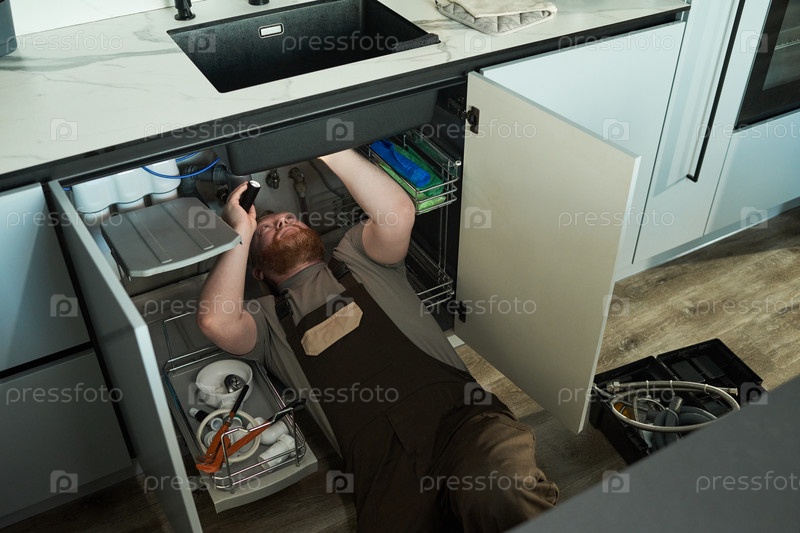 Мужчина средних лет работает под кухонной раковиной, устанавливая водопроводные трубы