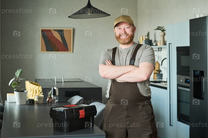 Мужчина средних лет улыбается, стоя на современной кухне