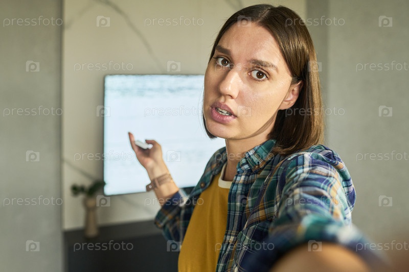 Портрет молодой взрослой женщины, объясняющей проблему с телевизионным экраном