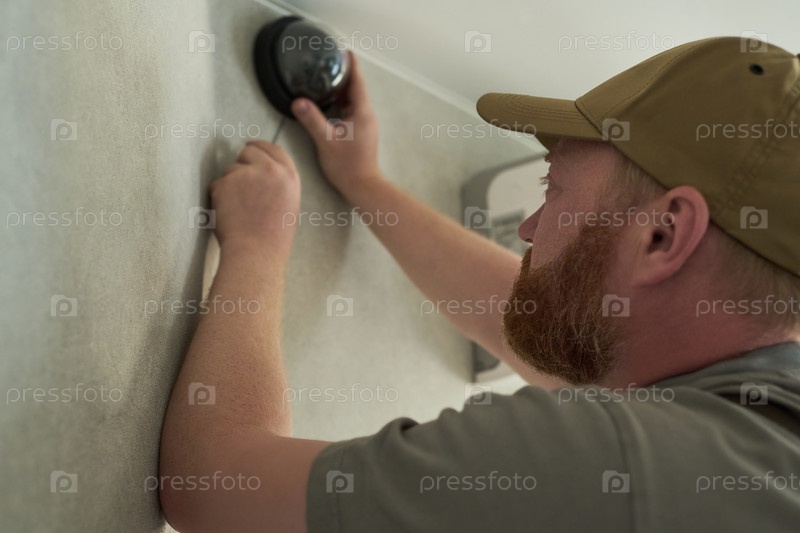 Мужчина средних лет устанавливает камеру видеонаблюдения на внутренней стене