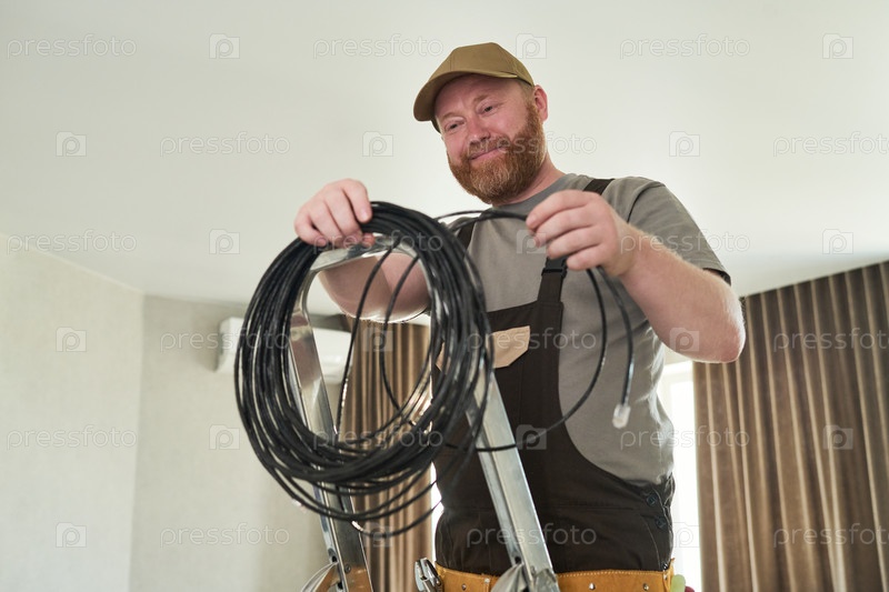 Мужчина средних лет устанавливает сетевой кабель, стоя на лестнице