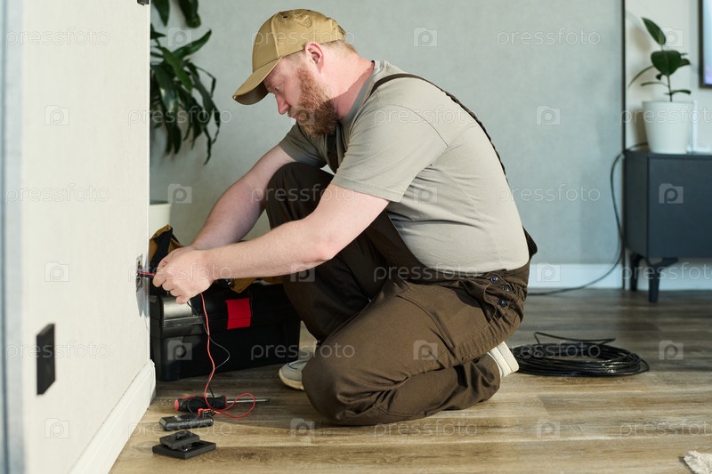Мужчина среднего возраста ремонтирует электрическую розетку в помещении, коленопреклоненный на полу