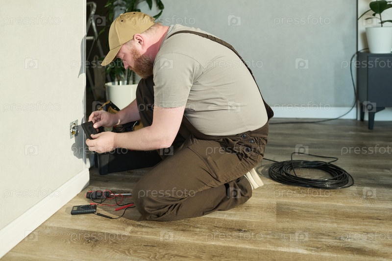 Мужчина средних лет ремонтирует розетку в современной квартире