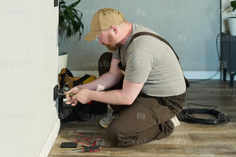 Мужчина среднего возраста, ремонтирующий розетку при коленях в помещении