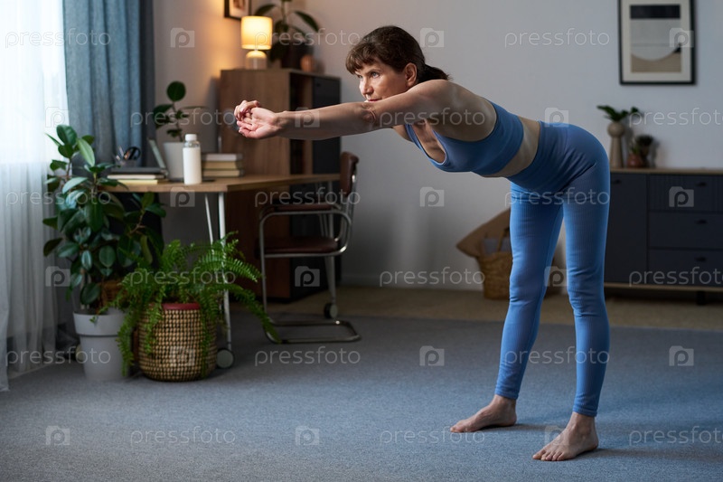 Старшая женщина практикует йогу, растягивание и упражнения в помещении