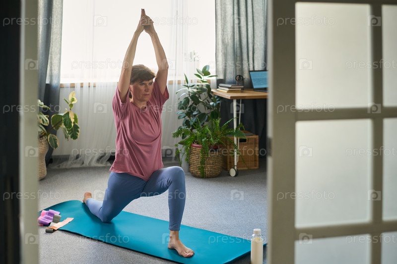 Женщина-старший практикует йогу на коврике в помещении днем