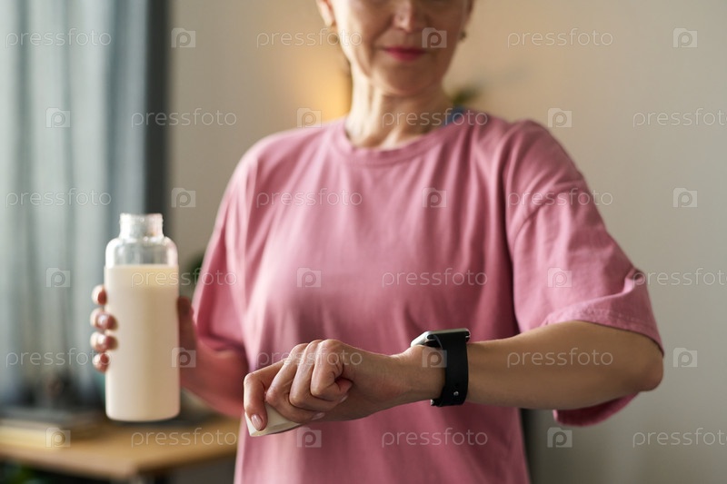 Старшая женщина проверяет умные часы, держа протеиновый коктейль