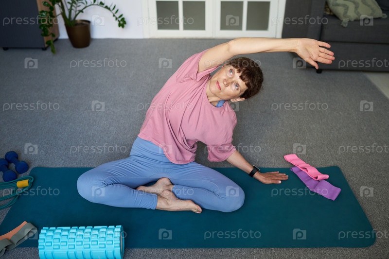 Старшая женщина растягивается на йога-матке во время домашней тренировки