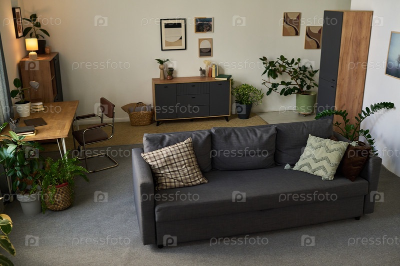 Интерьер гостиной с диваном и столом в уютной современной домашней обстановке