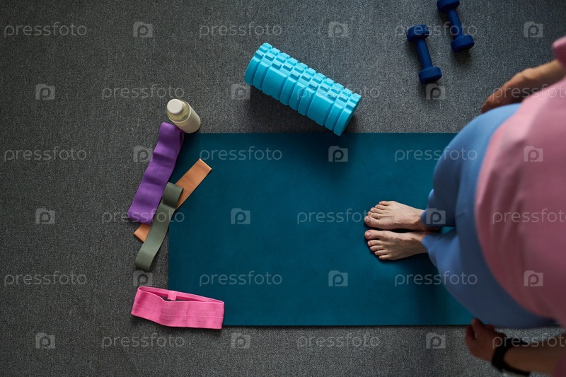 Женщина стоит на йога-матке, готовясь к тренировке