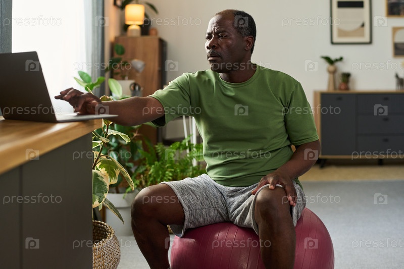 Чёрный мужчина сидит на тренировочном мяче с помощью ноутбука в помещении Senior