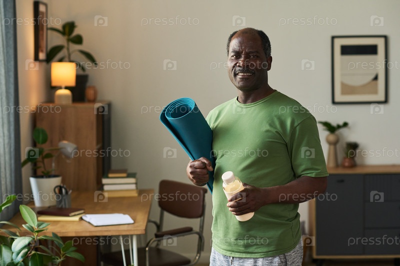 Портрет старшего чернокожего мужчины, улыбающегося в то время как он держит матку для йоги и бутылку с водой