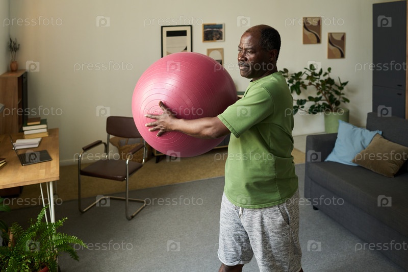 Старший чернокожий мужчина тренируется с фитнес-боллом в помещении Поддержание здорового образа жизни