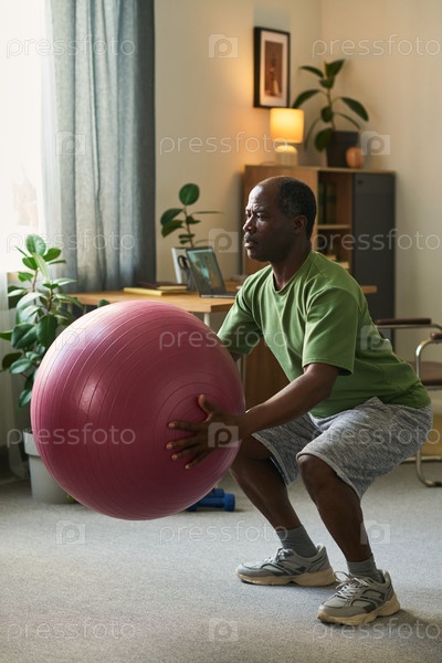 Старший чернокожий мужчина занимается спортом в помещении, держит фитнес-балл и приседает