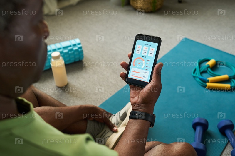 Чернокожий мужчина использует фитнес-приложение на смартфоне во время домашней тренировки