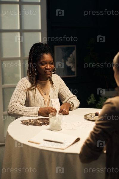 Молодая чернокожая женщина читает карты Таро для женщины в помещении