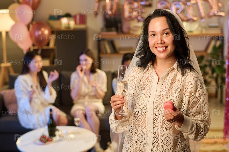 Портрет женщины в брачном плаще, улыбающейся и держащей макарон с шампанским