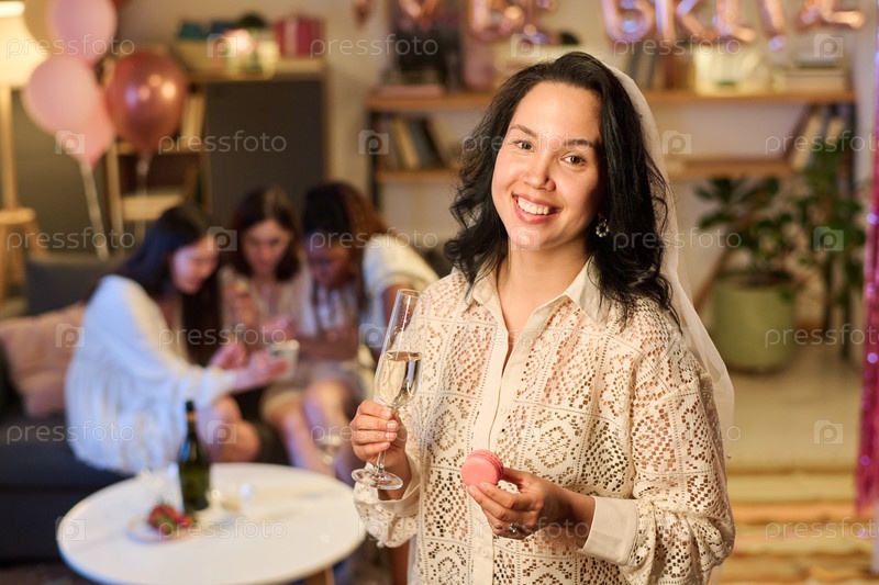 Портрет молодой невесты улыбающейся, держащей макарон и шампанское