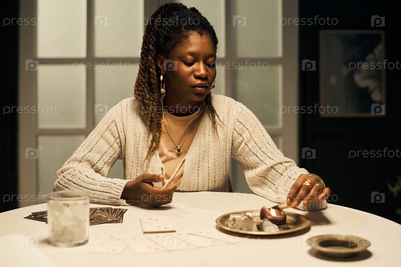 Молодая взрослая чернокожая женщина читает карты Таро и выбирает кристаллы за столом