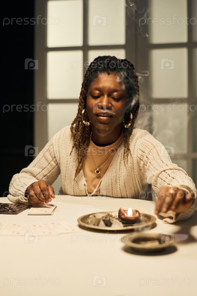 Молодая взрослая чернокожая женщина выполняет чтение карт таро с горящим фимиамом