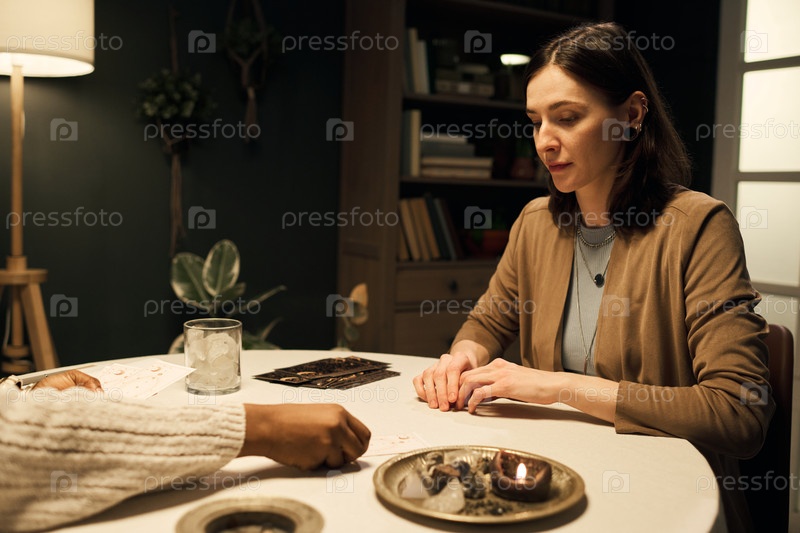 Молодая взрослая женщина, участвующая в сессии чтения карт Таро внутри помещений