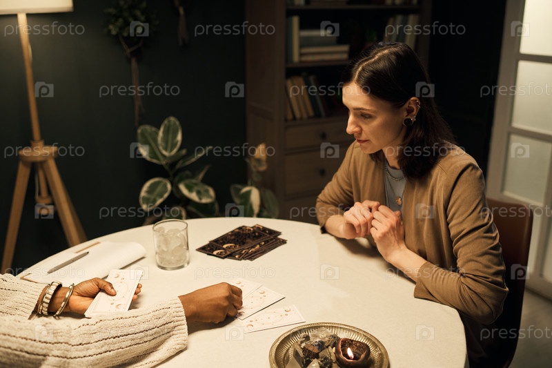 Молодая женщина получает чтение карт таро от черной женщины в помещении