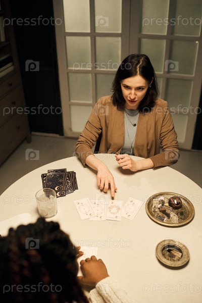 Молодая взрослая женщина читает карты Таро для чернокожей женщины за столом