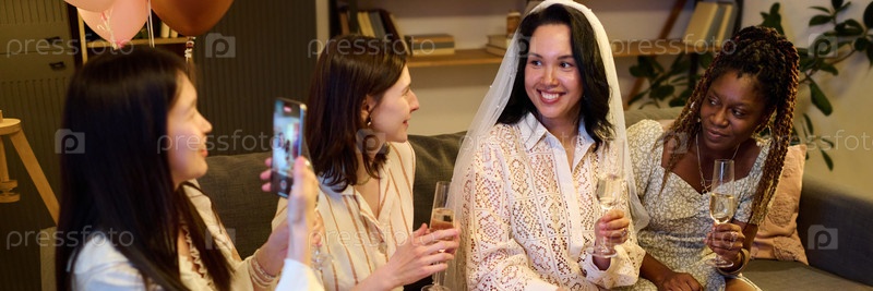 Молодые мультиэтнические женщины улыбаются и приносят тосты невеста носит платок на вечеринке