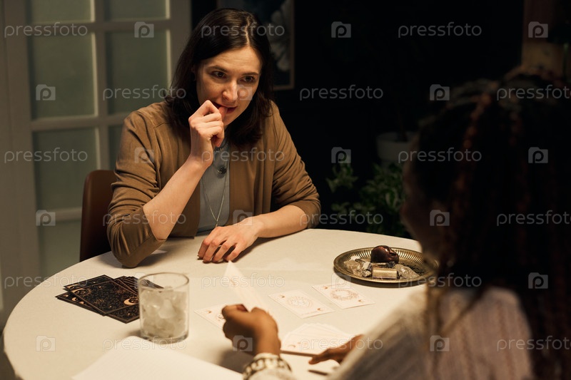 Молодая женщина реагирует во время чтения карт Таро с черной женщиной