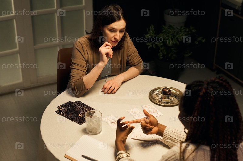 Молодая женщина слушает черную женщину, объясняющую распространение таро