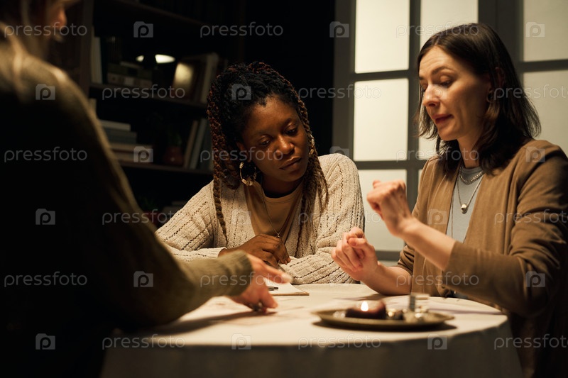 Молодая женщина выбирает карту Таро во время чтения с женской мистикой