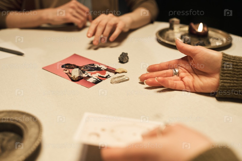 Женщины выполняют ритуал чтения карт Таро с помощью кристаллов в помещении