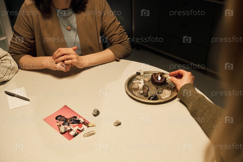 Две молодые женщины выполняют духовный ритуал с помощью фотографии, кристаллов и свечи