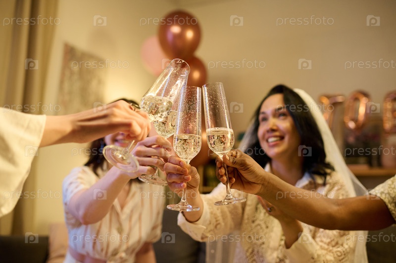 Разнообразные молодые женщины празднуют с шампанским тостом на свадебном душе