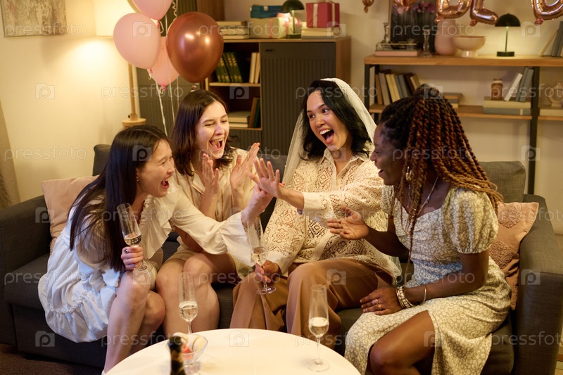 Группа молодых женщин, празднующих помолвку на домашней вечеринке