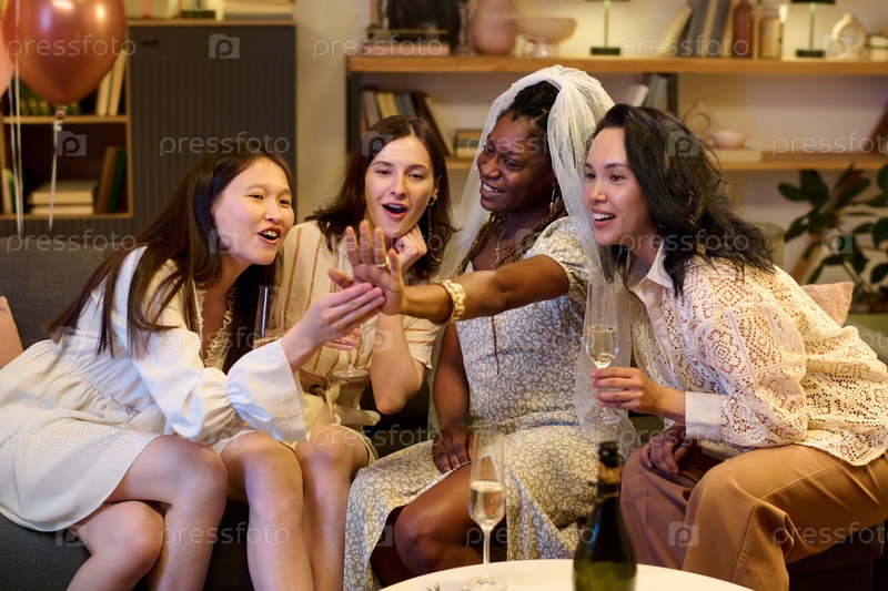 Разнообразные молодые женщины празднуют помолвку и невесту, показывающие кольцо