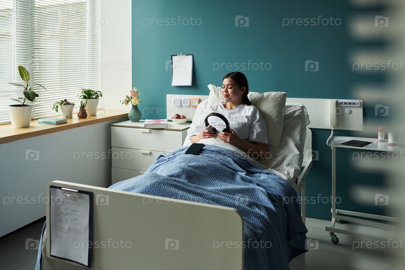 Беременная женщина отдыхает в больничной постели слушая музыку
