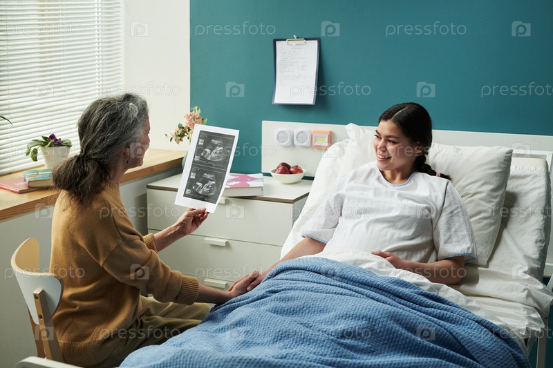Женщина восхищается ультразвуком во время посещения беременной старшей дочери