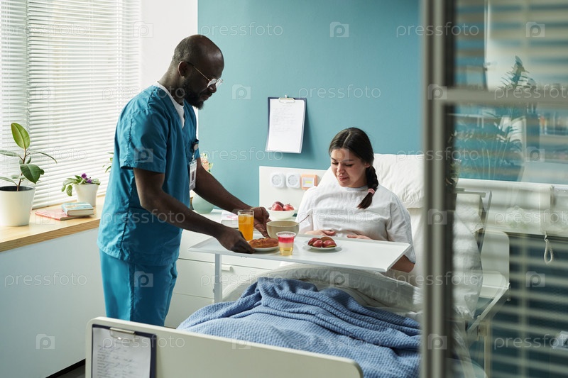 Медсестра подает завтрак молодой беременной женщине в роддоме
