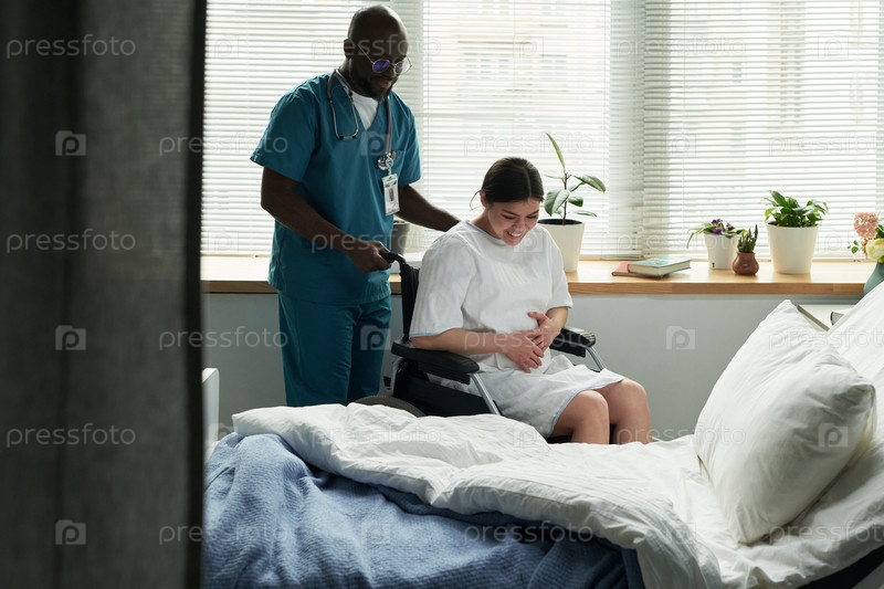 Чернокожий мужчина-попечитель перевозит беременную женщину на инвалидном кресле в клинику