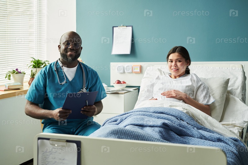 Портрет чернокожего мужского врача и беременной женщины больничной койки