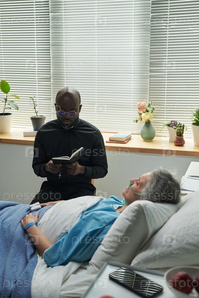 Черный мужской священник читает Библию пожилой женщине в хосписе