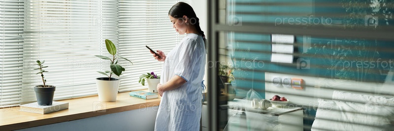 Беременная молодая женщина использует смартфон возле окна в роддоме