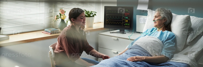 Молодая женщина утешает старшего родственника женщины в больничной постели